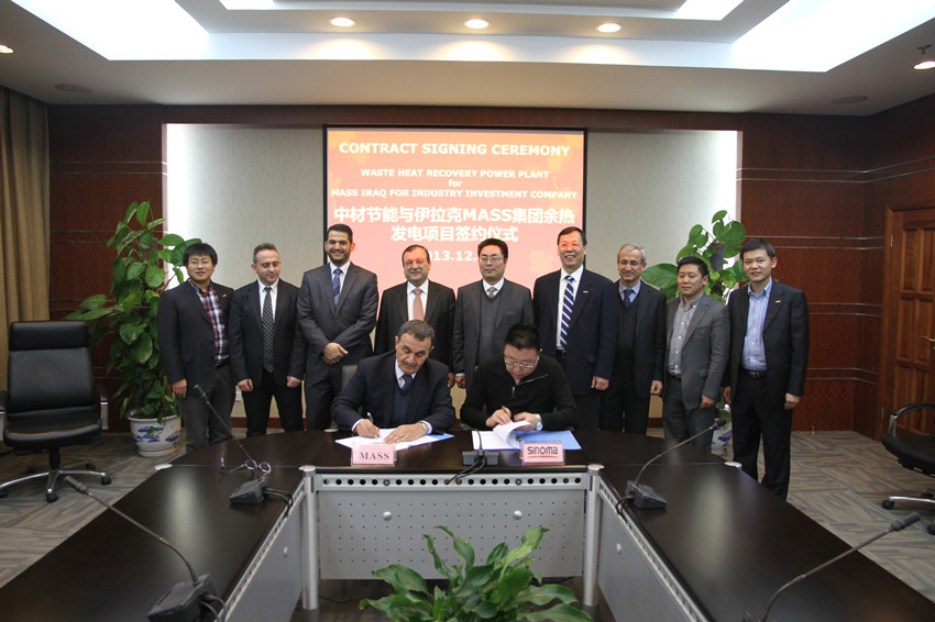 2013年12月18日,中材節能與伊拉克MASS工業投資集團(MASS Iraq for Industry Investment Company)在昆山成功簽署了伊拉克首個水泥窯余熱發電項目總承包合同。這是中材節能繼在承接沙特、阿聯酋水泥窯余熱發電總承包工程之后,在中東市場上獲得的又一重要訂單。該項目是利用伊拉克MASS集團旗下的SCP水泥廠3條日產5000噸水泥生產線建設的余熱發電項目,該項目總裝機規模為25MW。